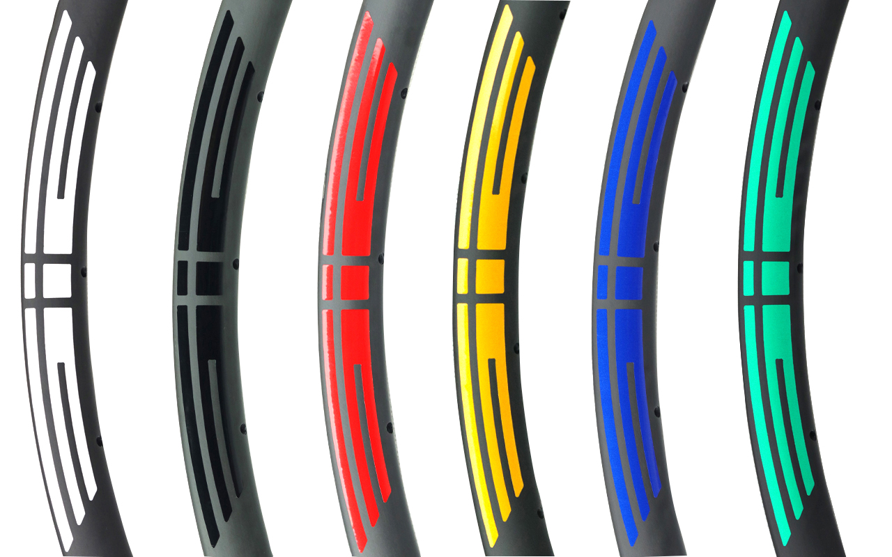 This process uses PVC material with an adhesive backing to apply directly to the rim surface and is compatible with all rim finishes. The application is simple and can be easily removed. Stickers can be applied by us or by the rider after delivery.