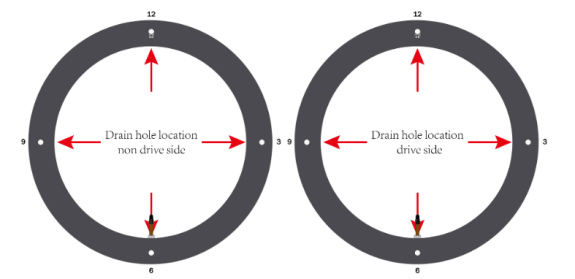 Typically, the valve hole is positioned at 6 o’clock, while the drainage hole is drilled at the 9 o’clock position on the non-drive side, with a 2.5mm diameter.